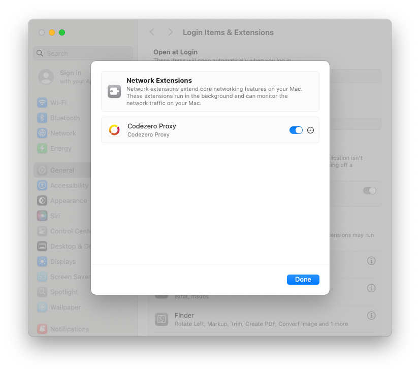 3. Click the switch next to "Codezero Proxy" to enable the Codezero Network Extension: